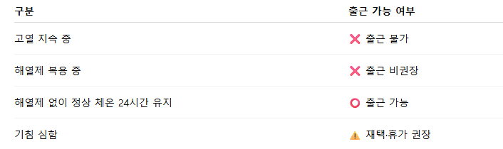 📌 즉, 열이 내렸다고 바로 출근하는 것은 권장되지 않습니다.